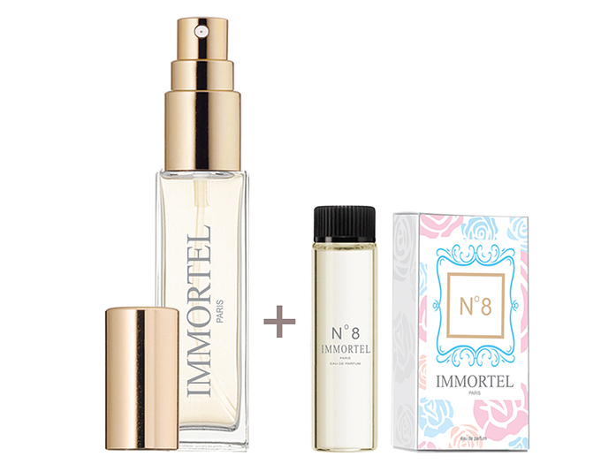 Nước hoa Immortel No8 có hương thơm được tạo thành từ gỗ sồi và hoắc hương, đan xen với tinh chất hoa hồng tháng 5, dầu hoa cam và hoa nhài. Bộ sản phẩm gồm một chai dạng xịt 8 ml và một chai dạng nạp 12 ml, có giá niêm yết 329.000 đồng, cuối tuần này bán giá ưu đãi 170.000 đồng.