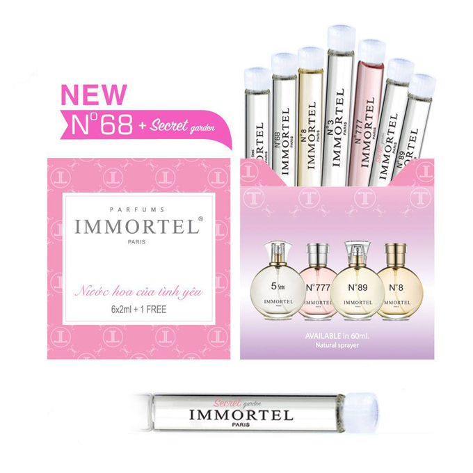 Bộ nước hoa mini của Immortel gồm 7 chai 2 ml với 7 mùi hương khác nhau. Ngoài mẫu hương No8, No89, No777, Secret Garden còn hương 5sens, No3, No68. Bộ sản phẩm có giá niêm yết 140.000 đồng, cuối tuần ưu đãi 39% còn 86.000 đồng.